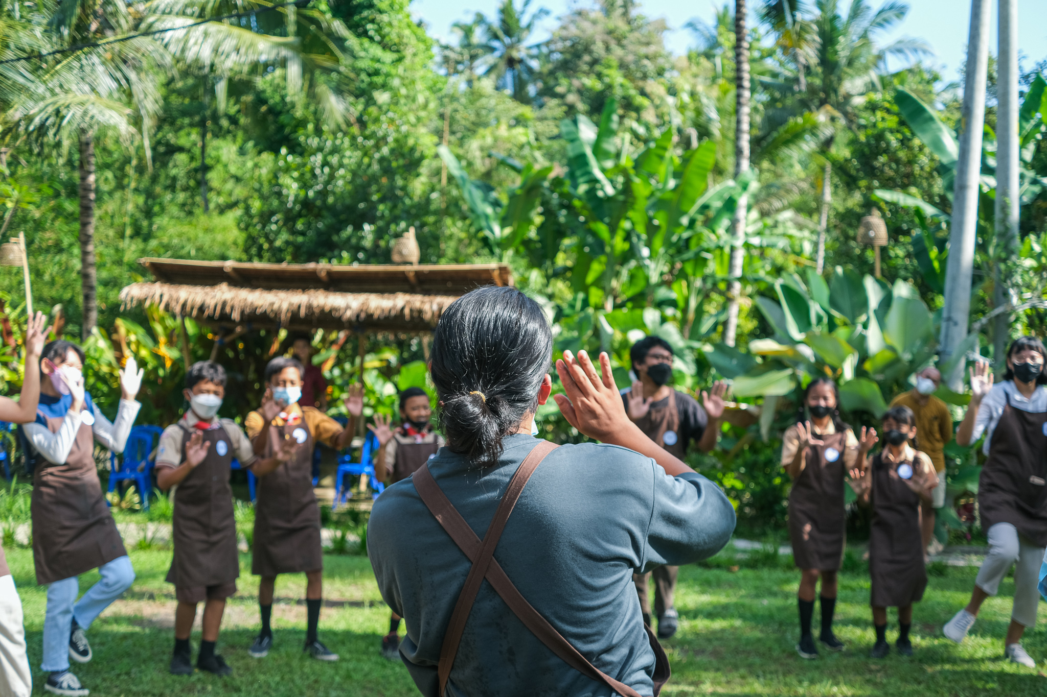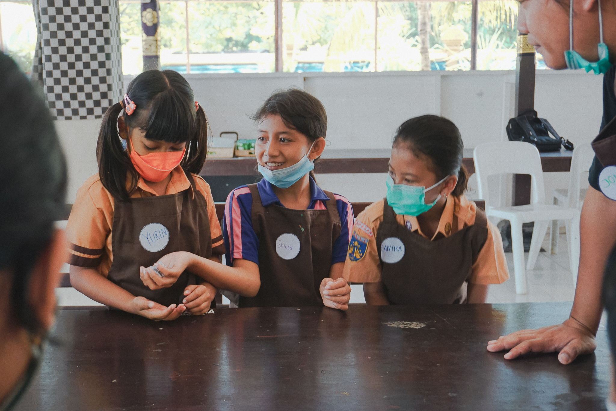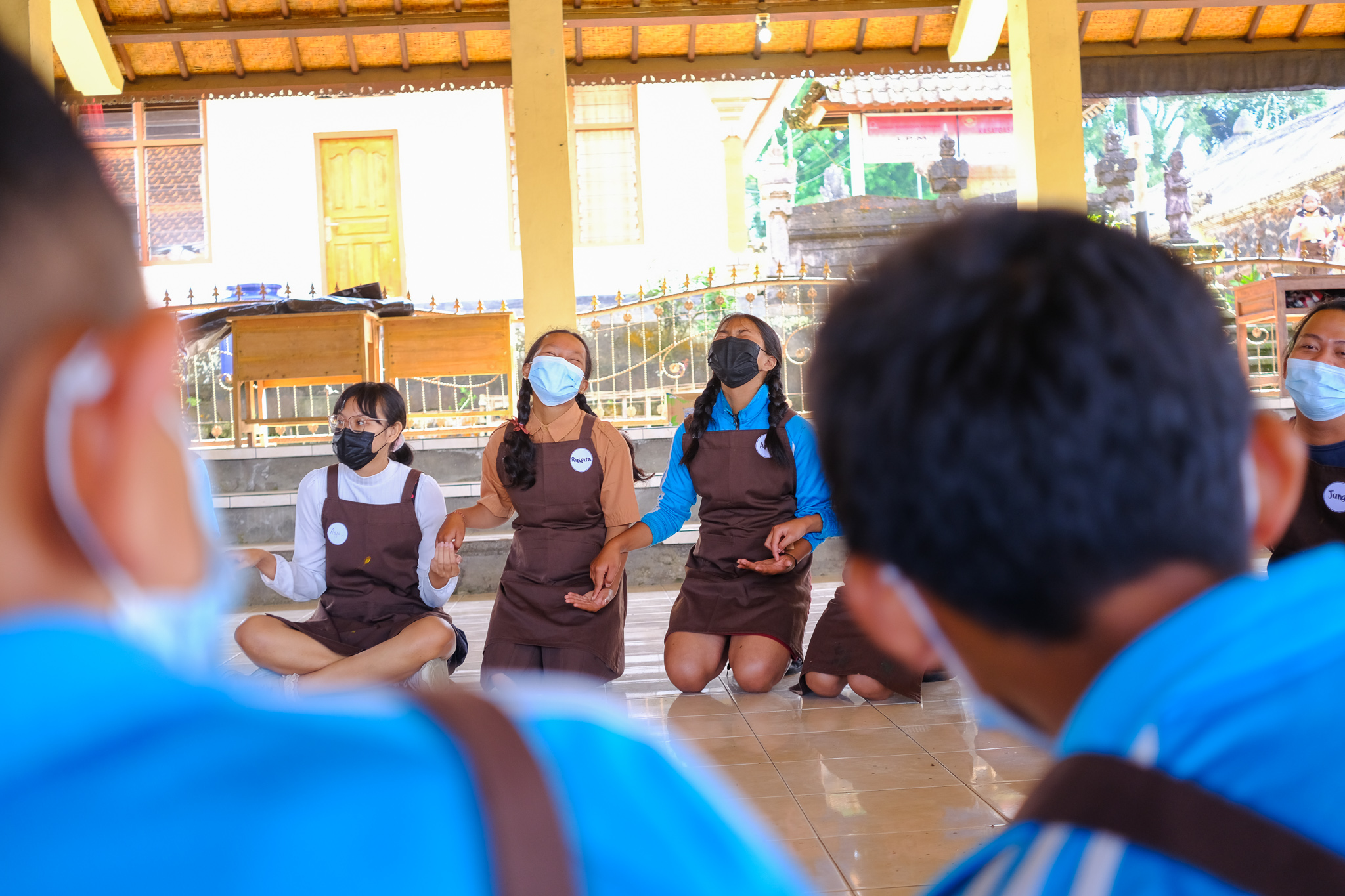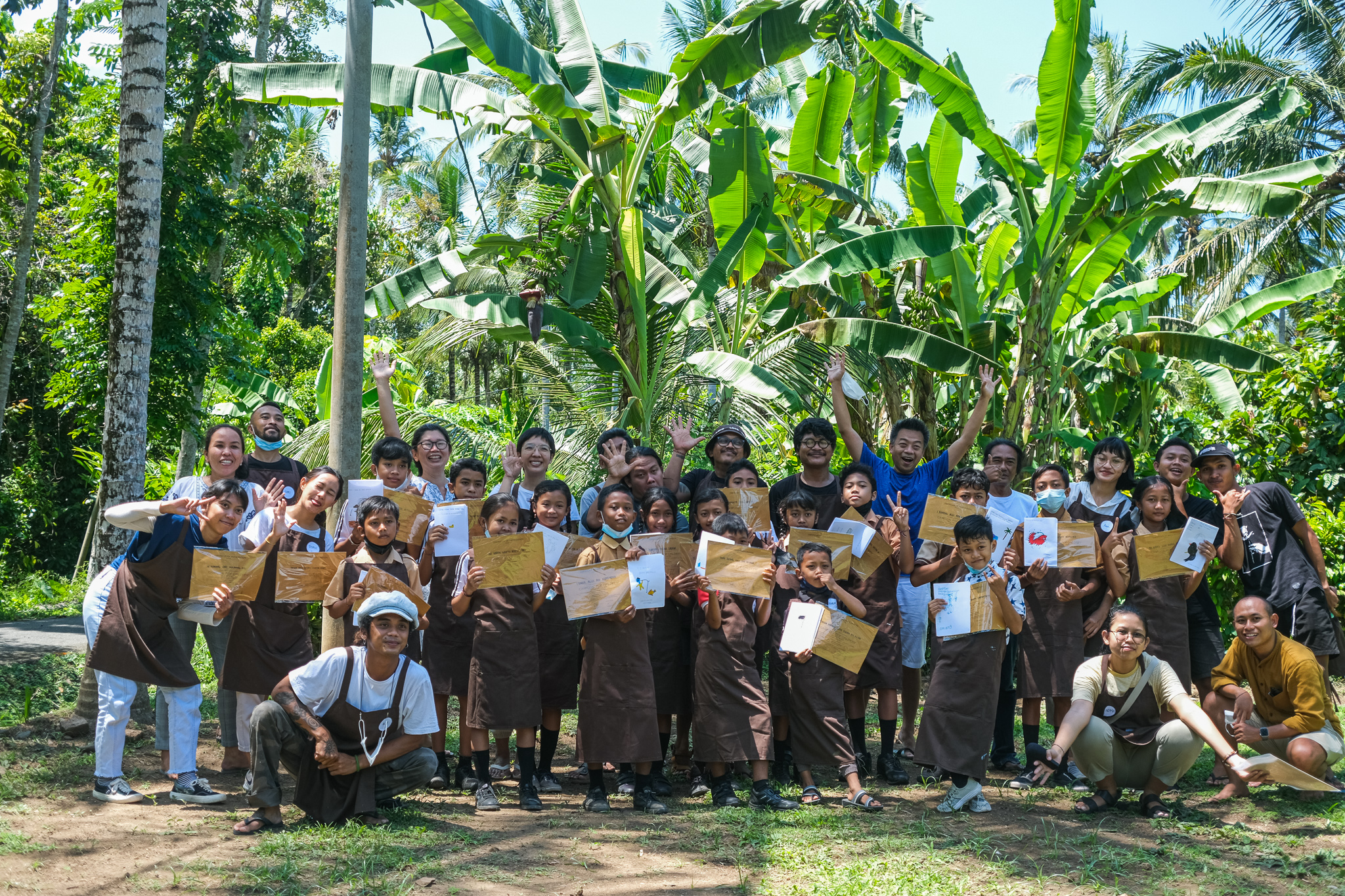 Our workshop continued to Candikusuma Village, Jembrana. In this fifth session, Students from 3 public elementary schools participated in various fun activities. The students each shared their short stories, and we got to learn about the village too. From coconut trees to marigold flower beds, Candikusuma represents the beauty of a Balinese village. A lot of taro plants also can be found in the village, and we used the leaves as a canvas to create water droplets collages.