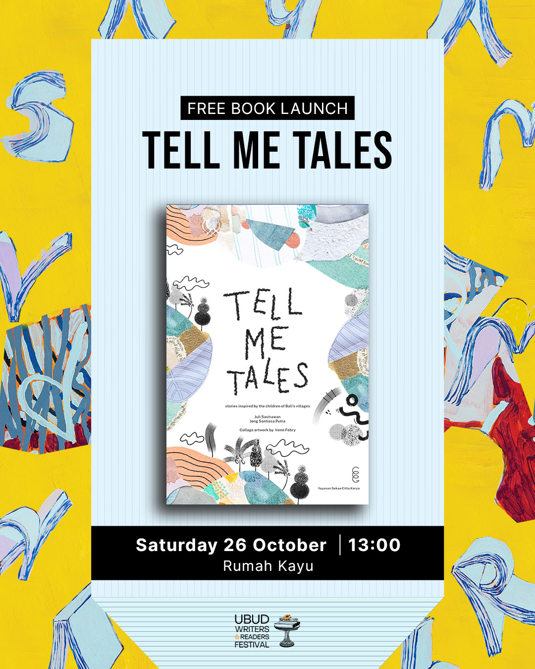 It was followed by a book discussion session together with Tell Me Tales book writers, Juli Sastrawan and Jong Santiasa Putra, Irene Febry the collage artist whose artworks are featured in each story, Debby Lukito who is the editor of the stories, as well as Opie Wardhani who works on the layout and cover for the book. Celebration included Irene Febry’s collage art exhibition especially created for the Tell Me Tales children book. Huge thanks to everyone involved in CFC2021/22/23 – Tell Me Tales