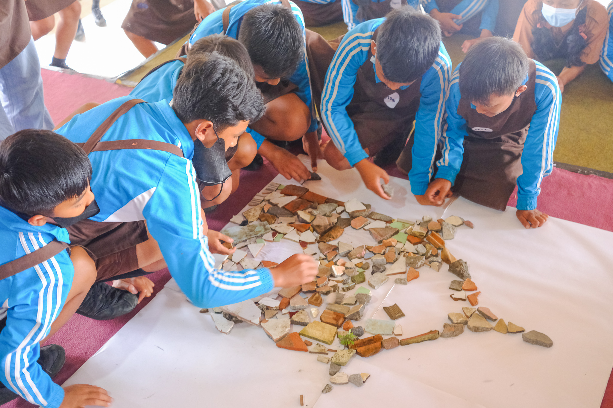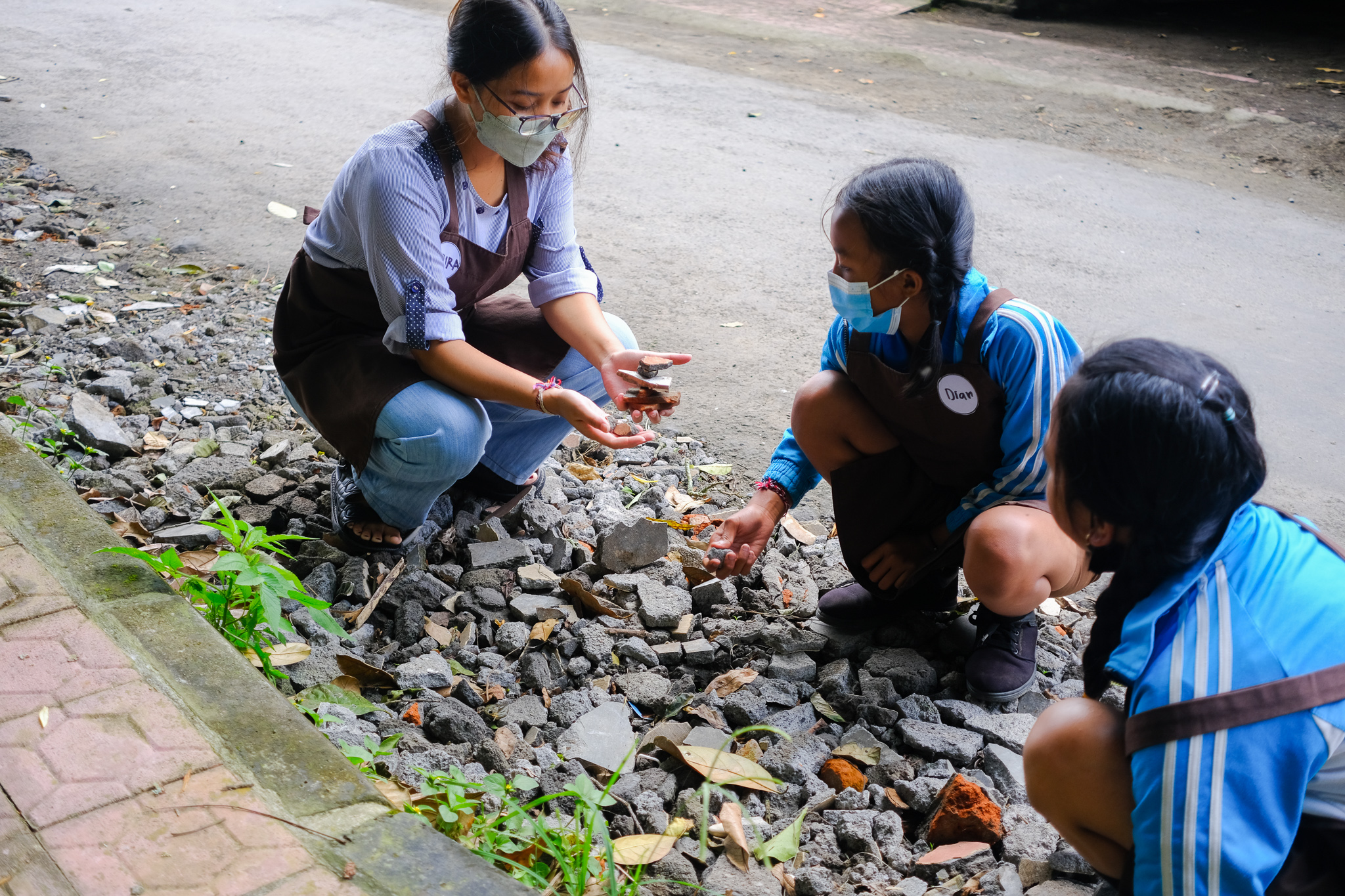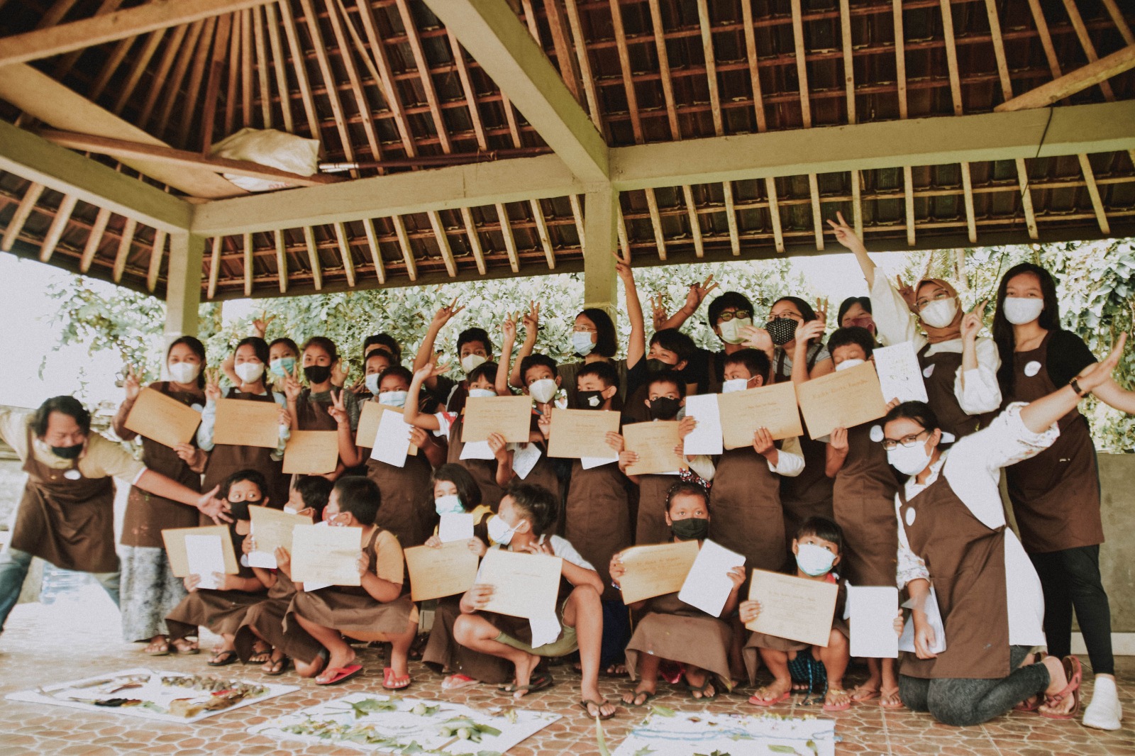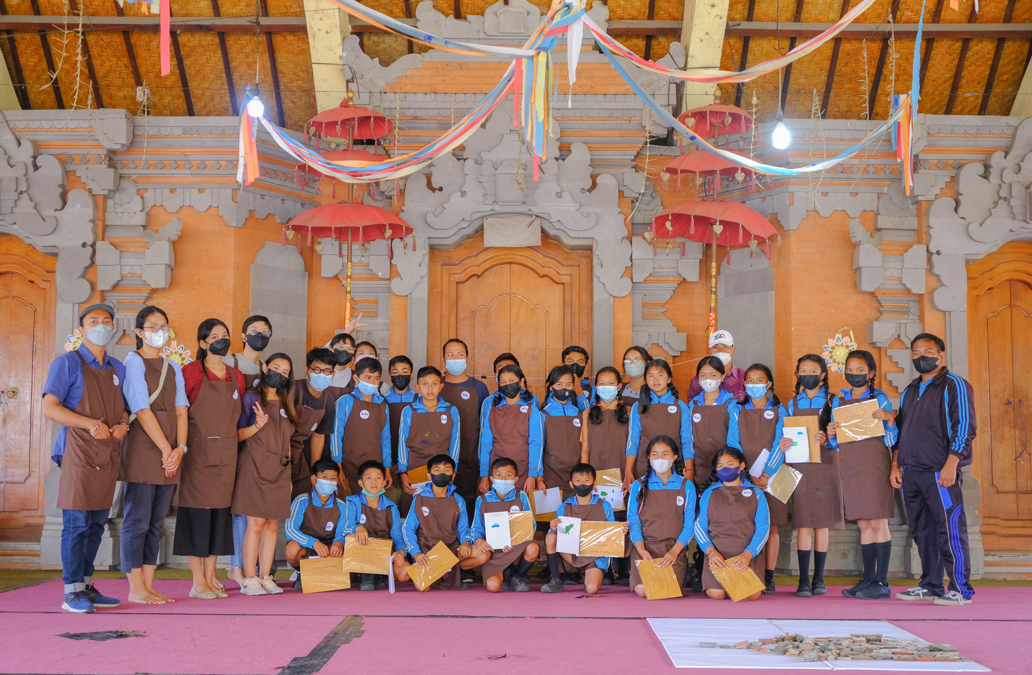 For our last stop, we visited Bayung Gede Village, Kintamani. We were welcomed by the stunning panoramic view of the plateau of Bali. With the cooler temperature, you can find many oranges trees growing well here. Despite the early morning mist, students from SD Negeri Bayung Gede were enthusiastic during this sixth workshop. The twenty young participants, along with the workshop facilitators and volunteers, found inspirations from things around them to create their stories. Later, all participants went on a hunt for broken ceramic pieces from construction site nearby, and using that everyone built collage art of a house together.