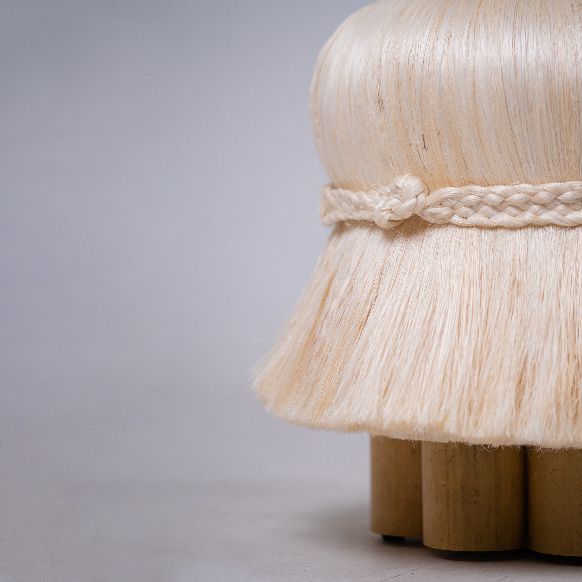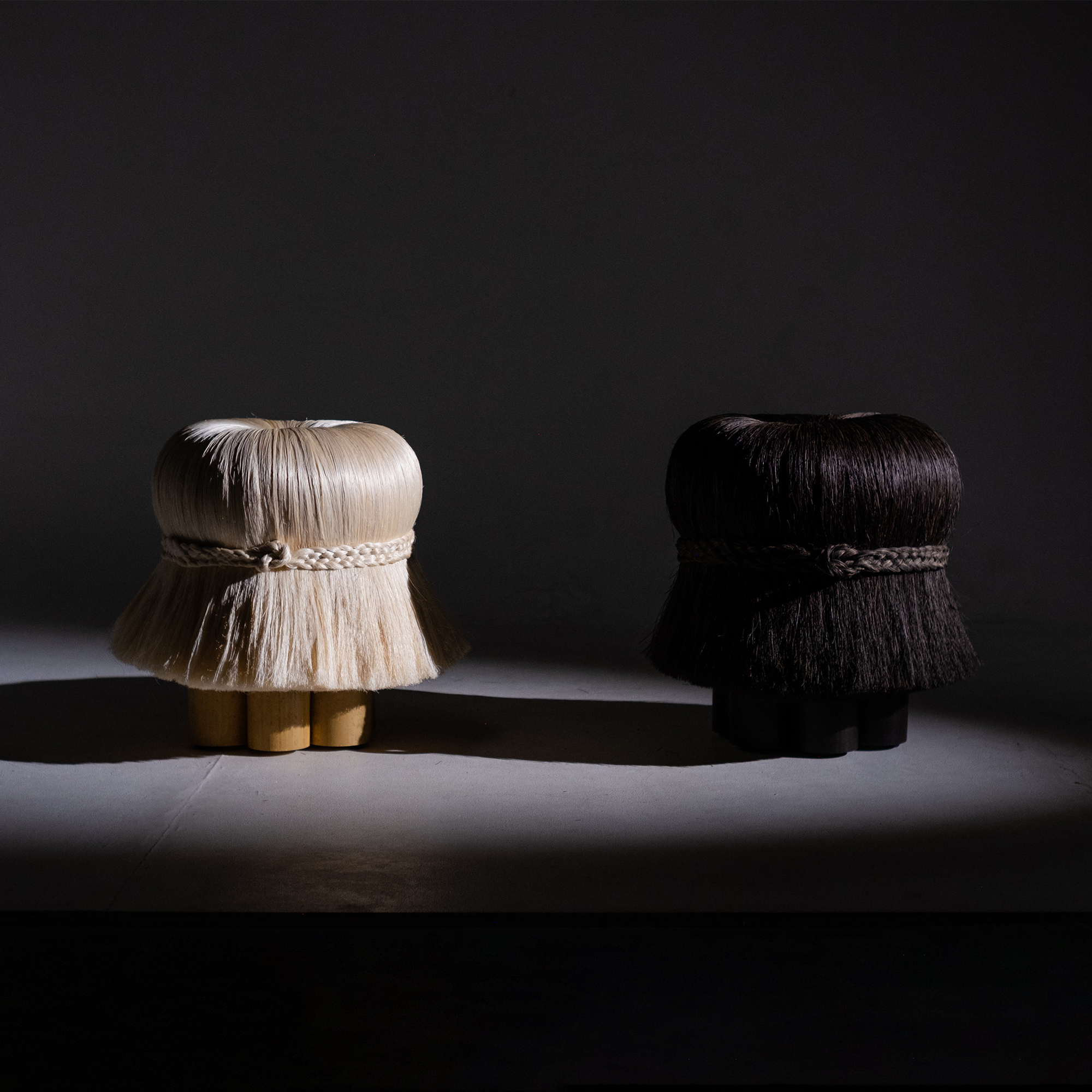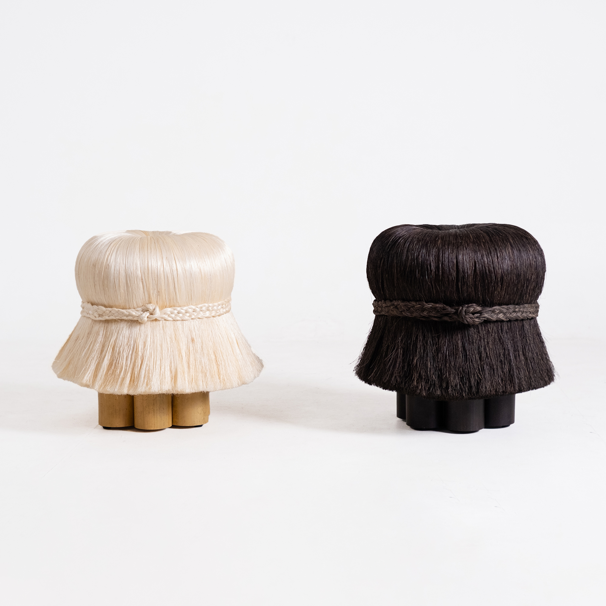 Named after the Indonesian word for “hair,” the Rambut stools celebrate texture, character, and duality. This vibrant duo contrasts black ijuk fiber, reminiscent of Balinese thatched roofs, with sisal gebang fiber, echoing the vibrant dance and theater costumes of Balinese Mythical creatures. With their expressive silhouettes, the stools embody the Rwa Bhineda philosophy—balance between opposites and symbolized by poleng. Hand-tied by artisan Jero Puspa, groomed, and styled by CushCush selected artisans, these stools are a delightful blend of playfulness and practicality.